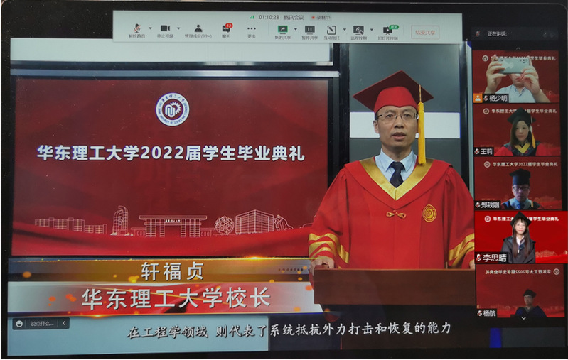 华东理工大学轩福贞校长代表学校、代表杜慧芳书记通过视频向2022届毕业生致以热烈的祝贺和最美好的祝福。希望毕业生们砥砺坚韧不拔的意志,成就前行的信心之源;砥砺勇承重载的能力,成就前行的力量之源;砥砺刚柔并济的品质,成就前行的动力之源;砥砺耐久致远的精神,成就前行的活力之源。希望同学们带着母校的祝福和希望,奔赴远方,让“海思路999号”“梅陇路130号”成为记忆中最温暖的地标。
