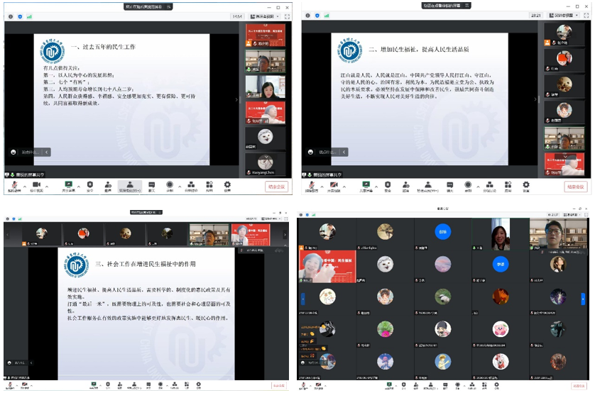 黄锐围绕“过去五年的民生工作”、“增加民生福祉,提高人民生活品质”、“社会工作在增进民生福祉中的作用”三个方面进行了详细讲解。在过去五年中,民生工作贯穿“以人民为中心的发展思想”、“七个‘有所’”、“人民群众的获得感、幸福感、安全感更加充实、更有保障、更可持续,共同富裕取得新成效”。报告会上,黄老师将十七大、十八大、十九大报告中关于民生福祉部分系统对比,详细阐述了二十大报告中关于民生板块的新变化,包括完善分配制度、实施就业优先战略、健全社会保障体系、推进健康中国建设等。最后,黄锐谈了“社会工作”在增进民生福祉中惠民生、暖民心的作用。认为,社会工作需要继续施行科学、制度化的惠民政策,既要关注物理上的可及性,也需要考虑社会和心理层面的可及性。