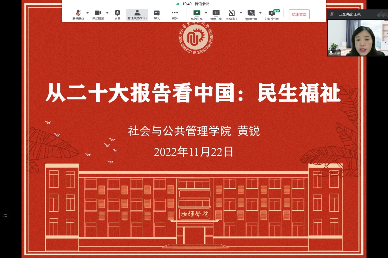为深入学习宣传贯彻党的二十大精神,PP电子官方网站党委于11月22日组织全体教职工开展理论学习。PP电子党的二十大精神宣讲团成员、社会与公共管理学院黄锐副教授受邀作了题为“从二十大报告看中国民生福祉”的专题辅导报告。学院教职工及部分研究生、本科生200余人参加了此次学习,院党委副书记王莉主持了本次报告会。