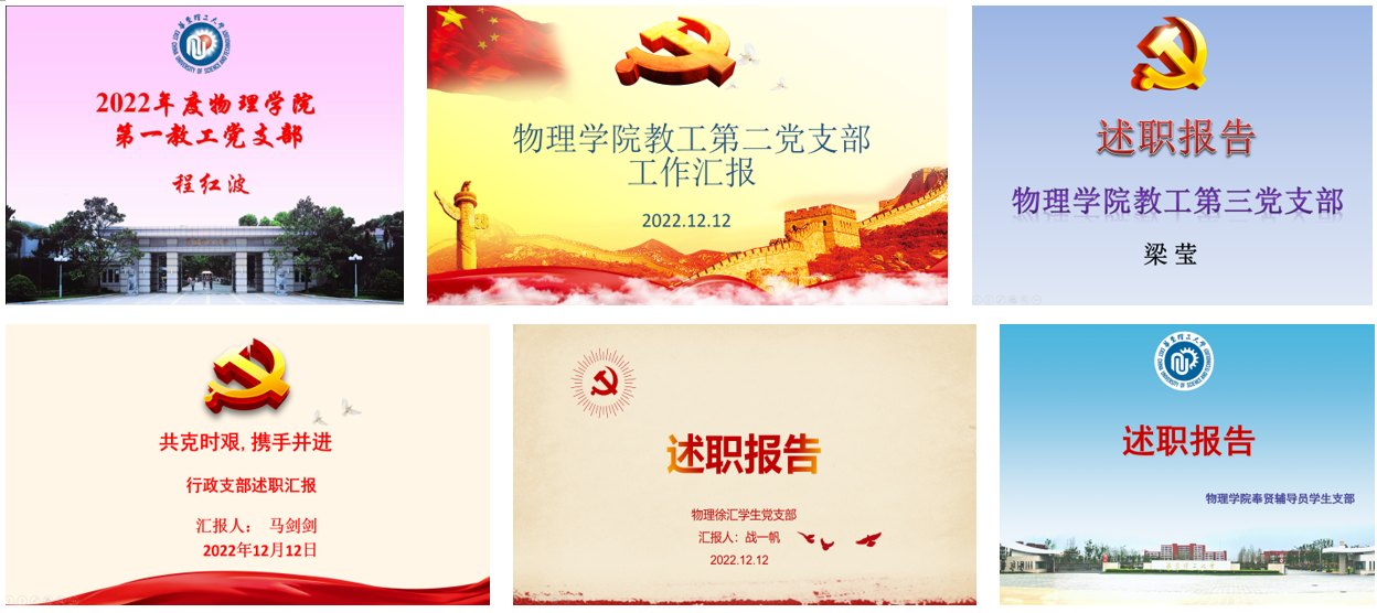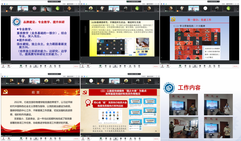 会上,教工第一至第三支部、行政支部、徐汇学生支部、奉贤辅导员-学生支部的6位支部书记,分别围绕2022年度党建工作主要成效、存在的问题和不足、改进工作的思路等方面进行了现场PPT陈述。除了“三会一课”等常规工作外,重点围绕疫情期间支部的号召力和党员的先锋模范作用、支部特色工作推进、党的二十大精神学习宣传等情况进行了展示。