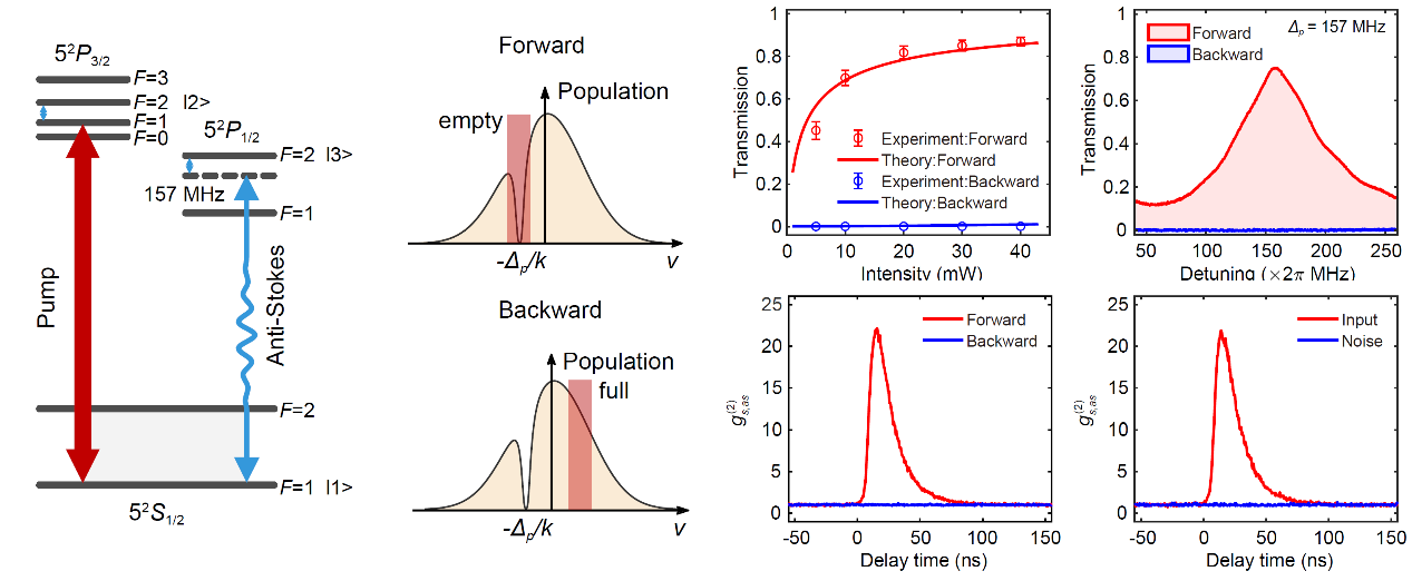 团队在前期以原子热运动实现非互易传输系列工作基础上,提出利用非相干泵浦实现无噪声的单光子光隔离,并在实验上进行了验证。对于热原子气体,考虑多普勒效应时,光学泵浦的结果将依赖于原子的速度和泵浦场的频率。通过控制泵浦场频率可以诱导出非对称的原子基态布居进而实现对光的非互易传输。由于所需要的泵浦光场强度较低,并且驱动频率与信号光子的频率相差巨大,因此系统的经典背景噪声可以很容易地消除;同时,泵浦光场诱导的布居转移过程是非相干的,因此也不会引入量子噪声。实验中采用碱金属铷原子气体,在40 mW的泵浦光强下实现了30.3 dB的隔离度,插入损耗仅为0.6 dB。二阶关联函数显示,单光子信号光的量子特性保持得很好。该方案在实用化量子网络和集成量子信息处理方面具有重要应用价值。