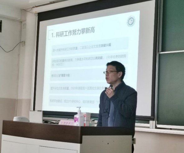 院长郑致刚代表学院行政班子作“凝心聚力担使命、踔厉奋发向未来、推进PP电子官方网站高质量发展建设新征程”的行政工作报告。他回顾了2022年学院在学科发展、本科教学、研究生培养、科学研究、安全与综合治理等方面的工作和取得的成绩,以及学院面临的困难与挑战。郑致刚表示,2023年学院将结合学校“双一流”建设总体方案,将重点工作围绕物理一级学科博士点高质量建设、应用物理学一流本科建设、本科教学审核评估展开,加强优势平台建设,全面提升学院的教学、科研和管理能力,促进立德树人和学科建设水平上一台阶。