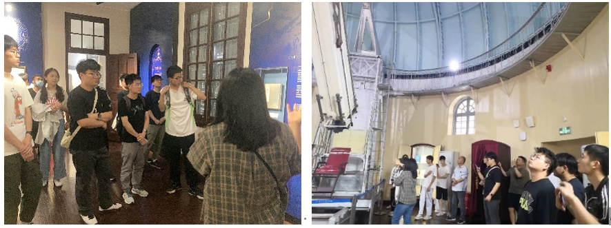 首先,大家共同参观了上海天文台天文博物馆,其位于上海市松江区佘山之巅。场馆内老师详细介绍了中国近代天文科学发展脉络、堪称国际天文学界启动国际合作的大型科学项目——天图计划、“镇台之宝”——40厘米双简折射望远镜的使用方法等。此外,大家还参观了佘山天文台于1901年拍摄的首张月球照片、帕兰子午仪测时仪器,并在观影室内观看了天文发展史电影。