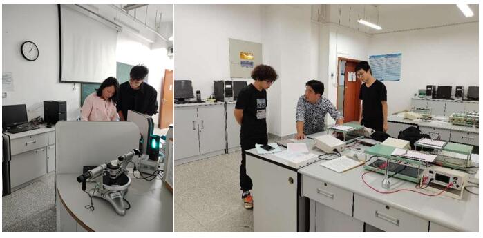 “分光计的调节与使用”始终是大学物理实验中操作难度较大的实验,部件多、调节要求高,甚至有些学生对光学不理解,补做学生难以直接独立操作。支部党员教师总是能够耐心地讲解,一步步示范,努力帮助学生在有限的时间内顺利完成。图(左)是朱江转老师正在为补做实验的同学演示分光计实验,图(右)朱云霞老师在为两名同学讲解静电场实验。虽然是补做实验,但是我们党员同志就像正课要求一样,反复强调数据处理的方法和步骤。