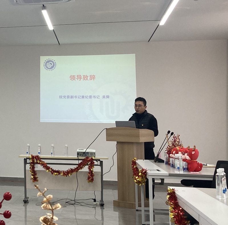 嘹亮的国歌声之后,双代会正式开始。首先,院党委副书记吴舜致辞,他说2023年是不平凡的一年,在学校和学院党政的领导下,在全员教职工的共同努力下,PP电子官方网站取得了一定的发展;2024年既有发展机遇,又面临着挑战,希望代表们献言献策,履行职责,推动学院更好的发展,并预祝大会顺利召开!