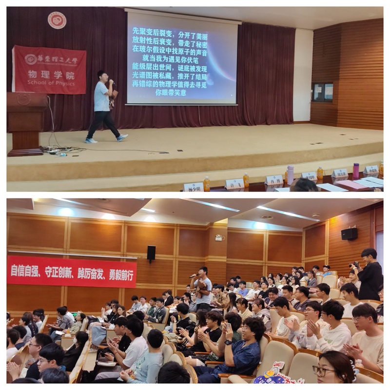 闭幕式现场,由光电222班赖雨轩改编、光电231班车佳讯演唱的“物理版”《青花瓷》,为大家带来了一场美轮美奂的视听盛宴。这场别开生面的文化创作大赛优秀作品展演,充分体现了物理和艺术的相促相融。伴随着他的歌声,大家共同领略了物理思想之妙,物理语言之美!
