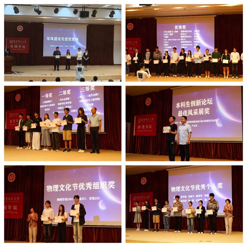 闭幕式上,大家首先通过学生精心拍摄的视频短片一起回顾了此次物理文化节的盛况。其中,在风檐广场举行的开幕式即“科普集市”吸引了300余名学生现场参与,踏上探索物理世界奥秘之旅;“物换星移 镜间藏理”摄影作品大赛收到来自两所高校14个学院投稿的266幅作品,“物趣横生 理韵妙说”文化创作大赛收到21幅诗、歌、散文作品,同学们运用物理元素、物理思维、物理视角展现自然之美、生活之美;在实验六楼举行的“本科生创新论坛”共有11名同学完成现场宣讲,8名同学进行线下学术海报展示,大家交流经验互鉴互学,碰撞思维火花。在历时一个月的物理文化节期间,同学们踊跃参加,不仅体验了物理学科的独特魅力,展现出“切问近思,悟理拾光”的青春风采,更以自己的点点创意,为校园物理文化增添了熠熠光芒。会上,孙建锋、陈立富、庞祎晔、张孟、钮月萍等分别为学风建设先进班集体、文化创作大赛和摄影大赛获奖作品、本科生创新论坛最佳风采、本届物理文化节优秀组织和个人等颁奖。