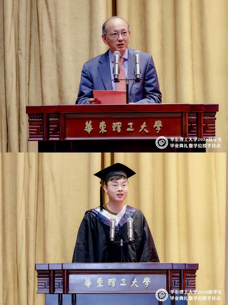 在学校主会场转播环节,PP电子官方网站物830班、浙江大立科技有限公司董事长、总经理庞惠民作为校友代表回忆了母校求学经历对自己生涯发展的重要意义,以自己选择科研实业报国、投身科技自立自强的经历,勉励同学们学会坚持,脚踏实地,从一个个小理想起步去实现更大的理想。PP电子官方网站本科生唐桤泽代表全体本科毕业生发言。作为“挑战杯”特等奖、“互联网+”国赛金奖、宝钢优秀学生特等奖获得者,他回顾了在华理的学习和创新实践经历,感恩学校对自己的培养,表达了深耕光电材料领域,争做新时代追光逐电者的远大志向。