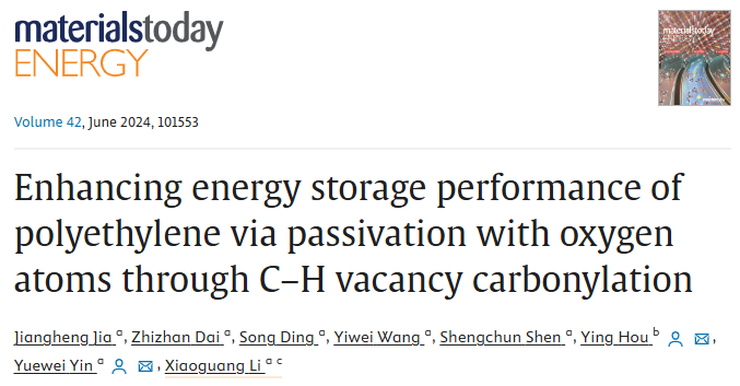 近日,PP电子PP电子官方网站侯莹教授与中国科学技术大学殷月伟教授合作,选择耐冻性强的聚乙烯(PE)薄膜作为基体材料,在电容性能优化方面取得新进展,相关成果以“Enhancing energy storage performance of polyethylene via passivation with oxygen atoms through C-H vacancy carbonylation”为题发表于Materials Today Energy (2024, 42, 101553) 期刊。