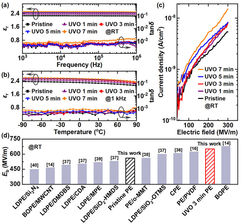 图1. 不同时间UVO处理后的PE薄膜的介电、电导和击穿特性。不同时间UVO处理后的PE薄膜的介电常数与介电损耗在室温下的(a)频率稳定性和(b)在频率为1 kHz下的温度稳定性,(c)室温下漏电流密度。(d)本工作与已报道的PE基电介质材料击穿场强的比较。