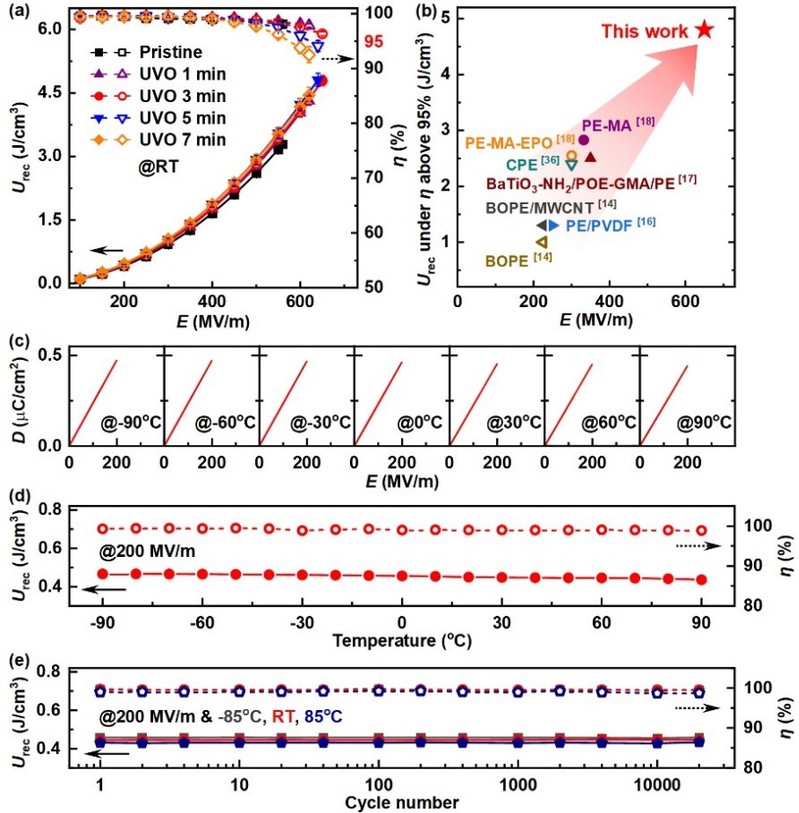 合作团队选择耐冻性强的聚乙烯(PE)薄膜作为基体材料,采用简便可控的紫外臭氧(UVO)表面改性工艺在薄膜表面引入极性羰基官能团,同时提升介电常数和击穿场强,实现了PE基材料中在储能效率高于95%条件下最高的放电能量密度。特别是,经UVO表面改性后的聚乙烯膜还具备良好的宽温区(-90℃至90℃)温度稳定性、充放电循环稳定性和极具应用价值的自愈性。