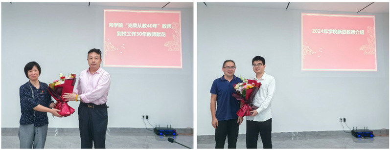 会上还特别设置了向学院“光荣从教40年”教师程红波教授和“新入职教师”胡宏龙博士献花的环节,并邀请他们分享经验和感悟。程红波老师深情回顾了自己从上海交大到华理工作的点点滴滴,以及伴随PP电子官方网站成长发展的历程。他和大家分享了执教近四十载的从教经验,指出教学和科研在他看来是互相促进、缺一不可的,作为高校教师必须做到教学科研两手抓、两不误。希望青年教师在学院的支持下可以勇挑重担,把个人理想融入学院发展大局。胡老师表达了新入职学院的感恩,表示将继承和发扬前辈们严谨治学的优良作风,勇担使命,接续奋斗,努力成为一名合格的教师。