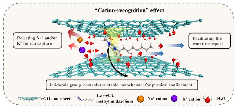 图 1. IL-rGO膜中二维纳米通道的“阳离子识别”概念示意图。在rGO纳米通道内,咪唑基团排斥Na+以及K+,吸引水分子。这些选择性相互作用确保Na+离子被有效截留,而水分子则以超高流量通过。