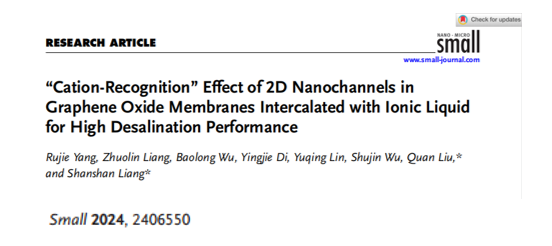 近日,我院梁珊珊副教授等在学术期刊Small(IF=13.0)上,以““Cation-recognition” Effect of 2D Nanochannels in Graphene Oxide Membranes Intercalated with Ionic Liquid for High Desalination Performance”为题发表了最新研究成果。该研究首次提出引入离子液体(IL)插层还原氧化石墨烯(rGO)膜实现了具有“阳离子识别”的二维通道。此方法制备出的二维膜IL-rGO膜展现出优异海水脱盐性能和高稳定性,为设计出先进的二维纳米通道提供了一种新的思路。