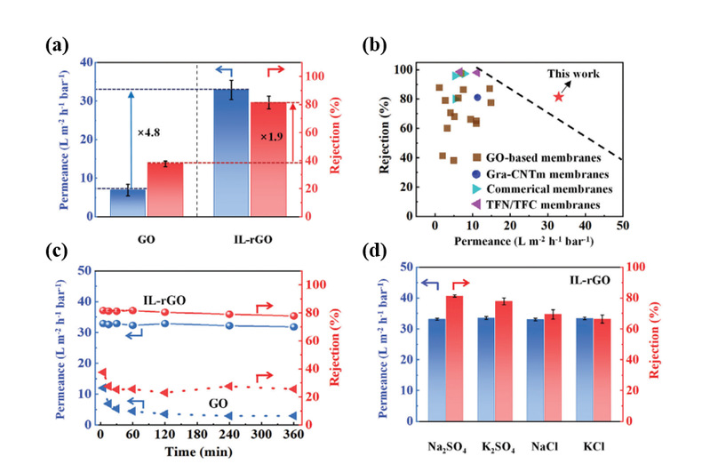 实验结果表明,IL-rGO膜是具有高效的海水淡化性能,实现了~32.9 L m-2 h-1 bar-1的超高水通量和~81.4%的Na2SO4截留率,优于其他文献中报道的最先进的纳滤膜(图2)。此外,即使经过长时间过滤并暴露于酸性和碱性溶液中,这种膜也很稳定,数月后也没有损坏或分解。此外,通过光谱实验表征和DFT计算阐明了石墨烯膜的识别效应,揭示了rGO纳米通道内的咪唑基团对阳离子的排斥效应和对水分子的吸引效应,即“离子识别性能”,从而导致水的选择性快速传输。这项工作突出了基于受限纳米通道内“阳离子识别”效应的合理设计与开发石墨烯基膜的潜力。此外,该方法不仅适用于海水淡化,还可扩展至包括渗透能量收集、资源提取和生物传感等在内的其他二维膜应用领域。综上所述,IL-rGO膜优异的海水淡化性能和出色的稳定性凸显了其在可持续海水淡化和废水处理方面的潜力,为开发先进分离二维膜以提供清洁水资源提供了前景广阔的工业应用。