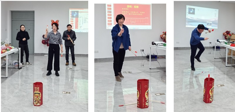 投壶和剑玉等民间游戏项目也备受欢迎。投壶者手持箭矢,专注地投向壶中,展现技巧的同时也增添了节日乐趣;剑玉则更具挑战性,玩家手执剑柄,用手腕的巧劲连绳将球抛起,套入木柄或“剑”凹陷处即为成功。多位老师迎难而上,观众们为他们加油鼓劲。