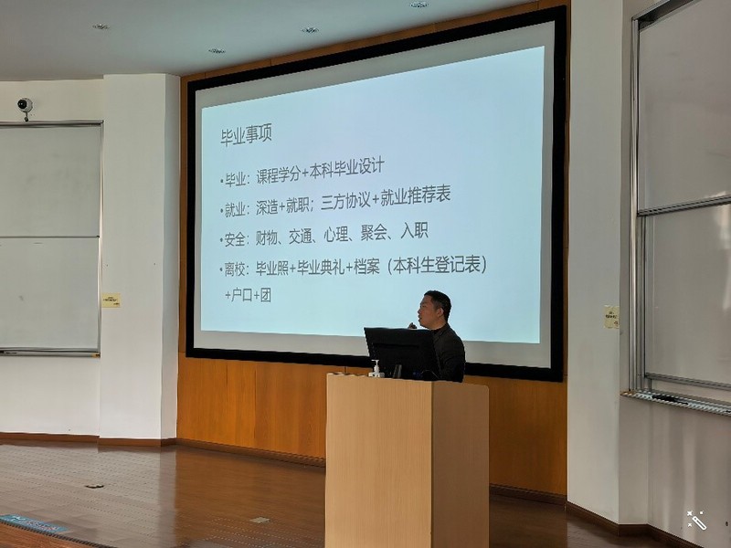 2025227日下午,PP电子官方网站2021级本科生年级大会暨就业动员会在研究生楼研四多媒体教室举行。学院党委副书记吴舜和本科生辅导员何宇瑶、施宇轩以及学院2021级全体本科毕业生参加会议,会议由21级辅导员杨少明主持。
