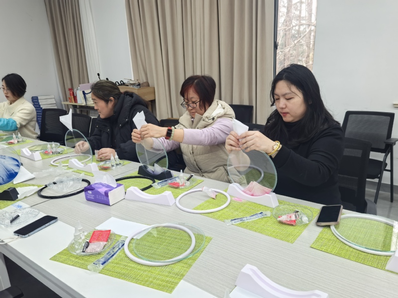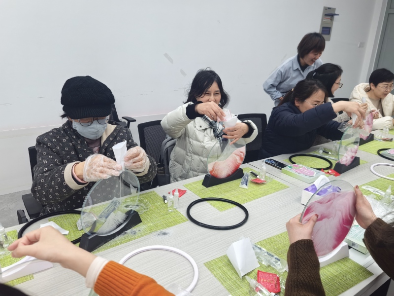 随后,在老师的指导下,女教师们开始动手制作流沙画。她们以沙为墨,以框为纸,充分发挥想象力与创造力“泼墨成画”。先折一个纸漏斗,小心翼翼地将沙子渗漏到透明的玻璃腔体中,之后缓缓注入甘油。每一次倾倒与摇晃都仿佛是在与物理规律共舞,通过调整沙子、气泡的位置,创造出独一无二的山川、河流、沙漠、海洋、星空等画面。在创作过程中,大家互相交流经验,分享心得,不时传来阵阵欢声笑语。