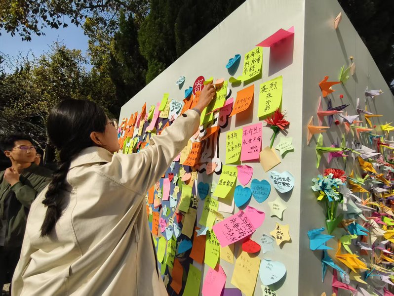 随后,支部成员参观烈士事迹陈列馆,通过珍贵影像资料和实物展品,深入了解英烈生平与革命历程,切身体会信仰的力量。在留言墙前,不少同学写下“革命英雄,永垂不朽”“您的精神永驻我心”等文字,表达崇高敬意。最后,大家手工折叠纸鹤,将敬意与思念寄托于彩纸之间,并统一悬挂于纪念墙前,构成一幅别具意义的缅怀图景。