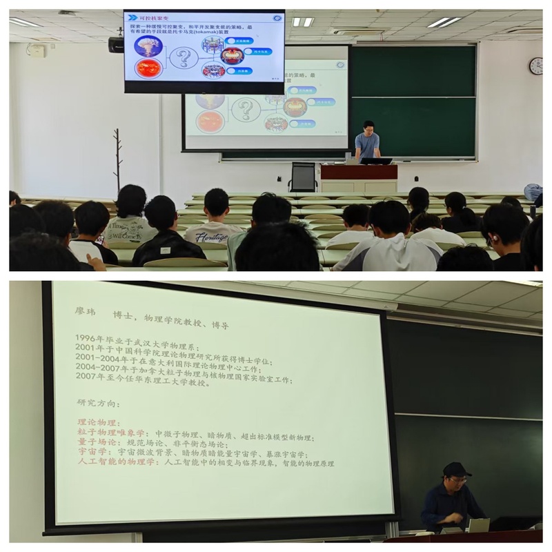 张德兵老师介绍了其所在课题组关于可控核聚变的前沿研究,通过对比中外科研范式,强调"基础研究需扎根于工程实践",为同学们介绍了其课题组的研究方向、科研优势以及未来前景,激发了学生投身大国重器的使命感。