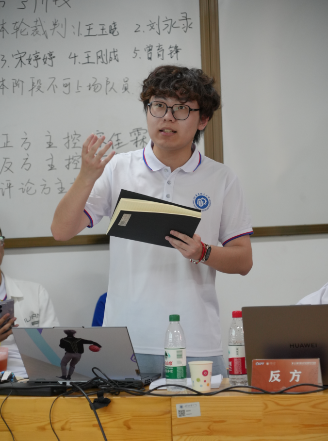 国赛现场上袁程凯同学作为反方主控队员进行讨论