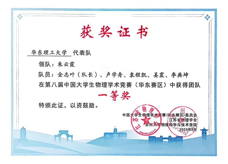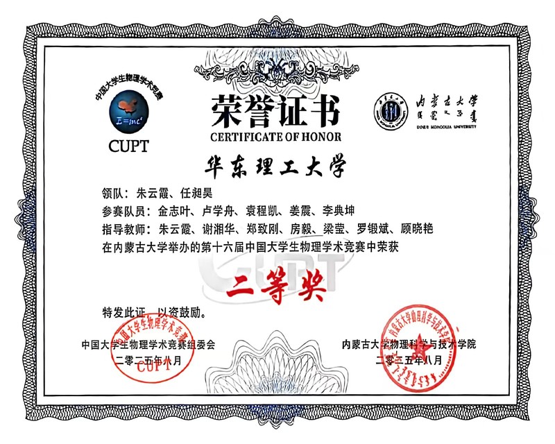 2025年8月19日,第十六届中国大学生物理学术竞赛在内蒙古大学圆满落幕。华东理工大学代表队凭借扎实的物理理论基础、创新的实验设计能力和出色的团队协作表现,从全国66所高校的67支队伍中脱颖而出,斩获全国二等奖,并获得了次年国赛的直通名额。